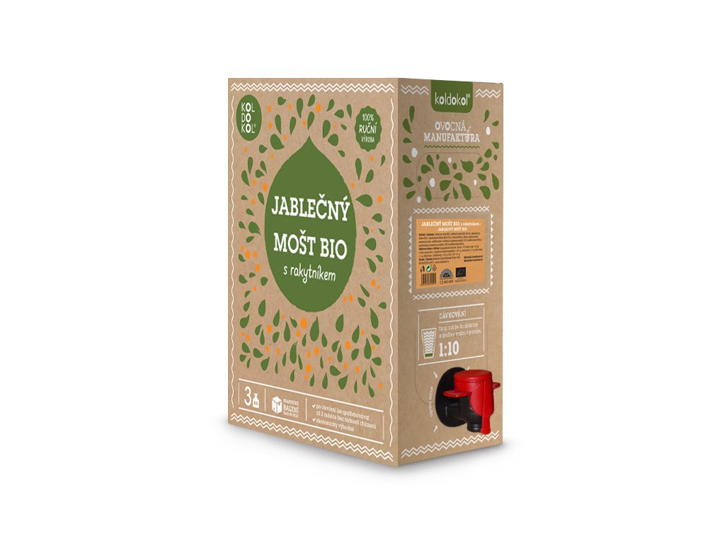 Složení: 95% jablečný mošt BIO, 5% rakytníková šťáva BIO.