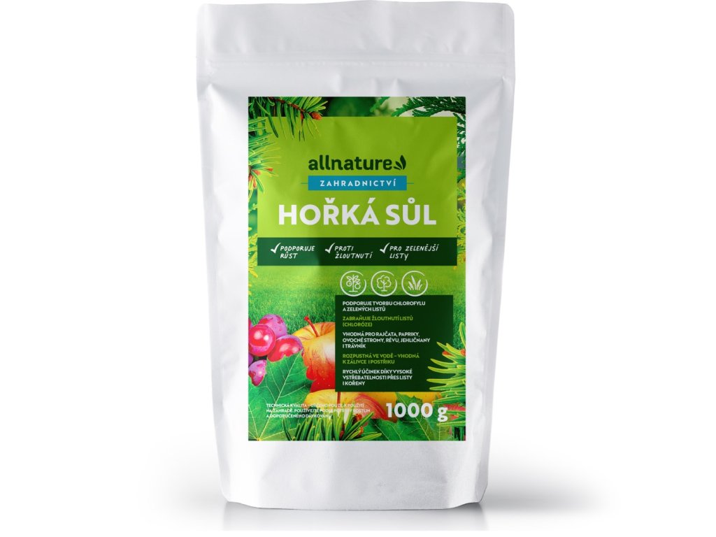 Hořká sůl je přírodní produkt bohatý na síran hořečnatý, ideální pro podporu růstu a vitality rostlin. Tato sůl pomáhá zlepšit fotosyntézu, podporuje tvorbu chlorofylu a prospívá kořenovému systému rostlin. Je vhodná pro širokou škálu plodin, od zeleniny až po okrasné květiny a trávníky.