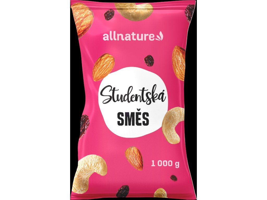 Allnature Studentská směs je chutná kombinace jader mandlí, kešu ořechů, lískových ořechů a rozinek. Vhodná jako svačinka do školy či práce.