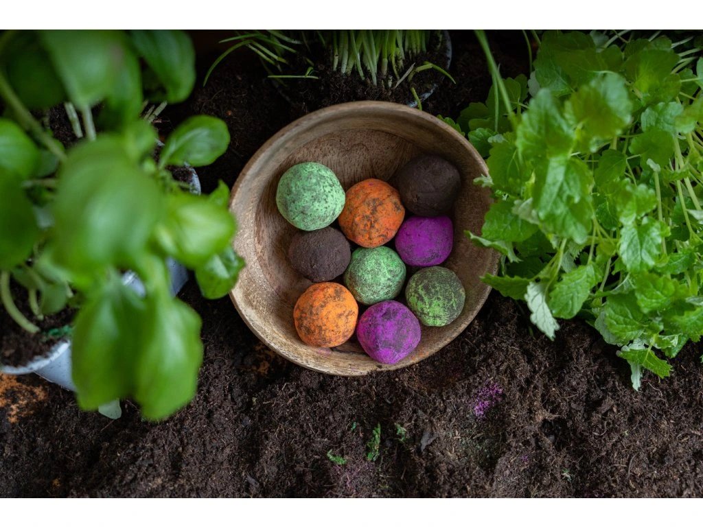 Tato krásná dárková krabička ukrývá pět barevných bylinkových bomb – ručně vyráběných koulí plných semínek oblíbených bylin a květin. Stačí je položit na hlínu, zalívat a nechat přírodu, aby ukázala své kouzlo.