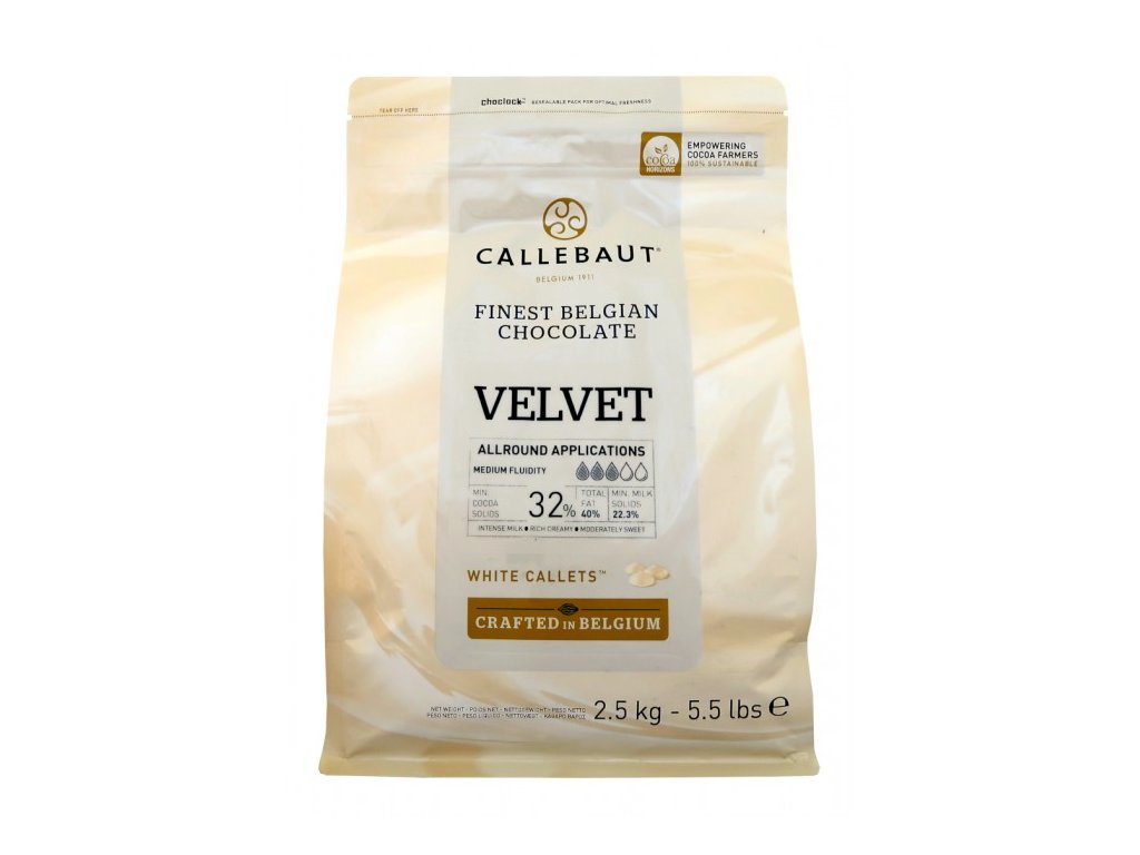 Bílá čokoláda Callebaut Velvet se zvýšeným obsahem kakaové složky na 32 % na úkor obsahu cukru je dodávaná ve formě drobných peciček (callets), které jsou balené v sáčcích po 2,5 kg.