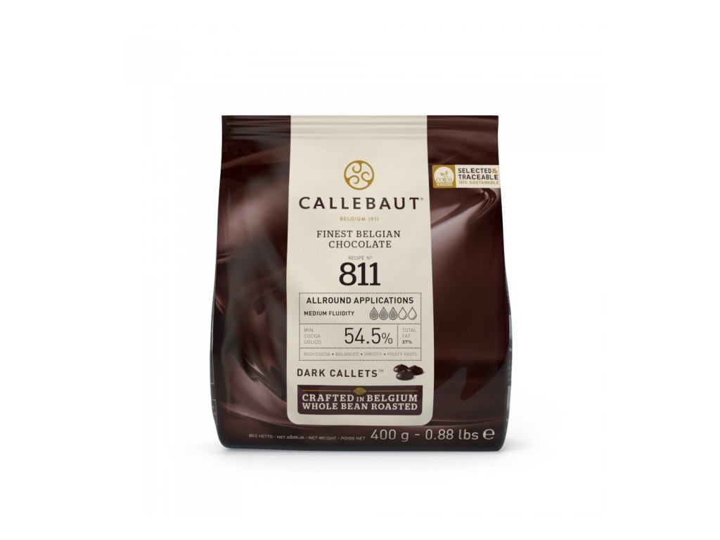 Hořká čokoláda Callebaut 811NV s obsahem kakaa 54,5 % dodávaná ve formě drobných peciček (callets), které jsou balené v sáčcích po 400 g.