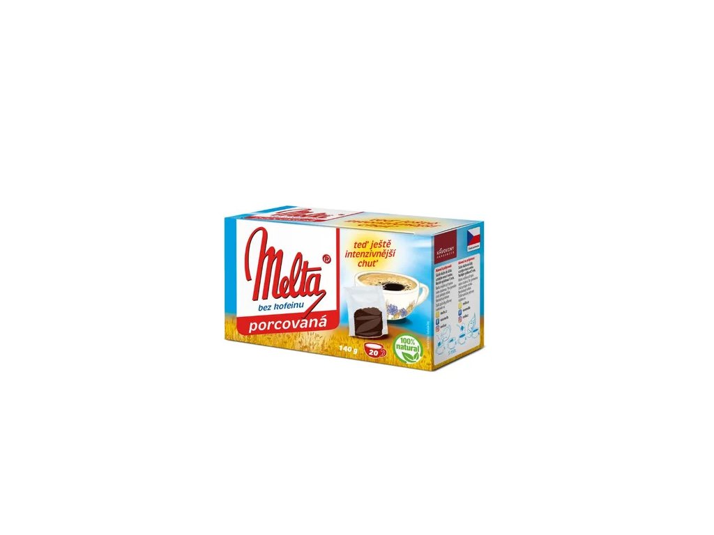 Kávoviny Melta porcovaná je směs k přípravě kávovinového nápoje, který je příjemnou alternativou ranní kávy i vhodným doplněním pitného režimu během dne. Je vyrobený pouze z darů přírody: obsahuje směs obilovin, kořen čekanky a je dochucený cukrovou řepou. Přípravek je vhodný i pro děti a kojící ženy.