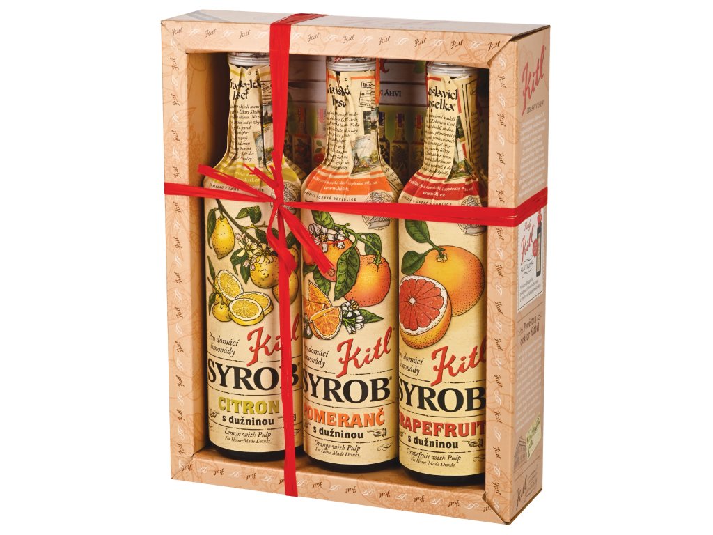 Papírová krabička z hnědé lepenky je vystlána dřevitou vlnou, zabalená v průhledné folii a ozdobená lýkem. Mezi sirupy navíc najdete skleničku Kitl 200 ml.