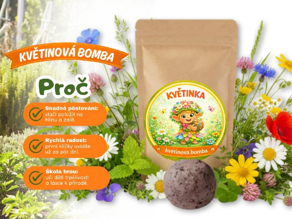 Květinová bomba pro děti obsahuje směs 17 různých druhů květinových semínek, které společně vytvoří pestrou, voňavou a hravou květinovou louku. Stačí ji zasadit do květináče, truhlíku nebo na záhonek, pravidelně zalévat a sledovat, jak se během přibližně dvou týdnů objeví první zelené lístky.