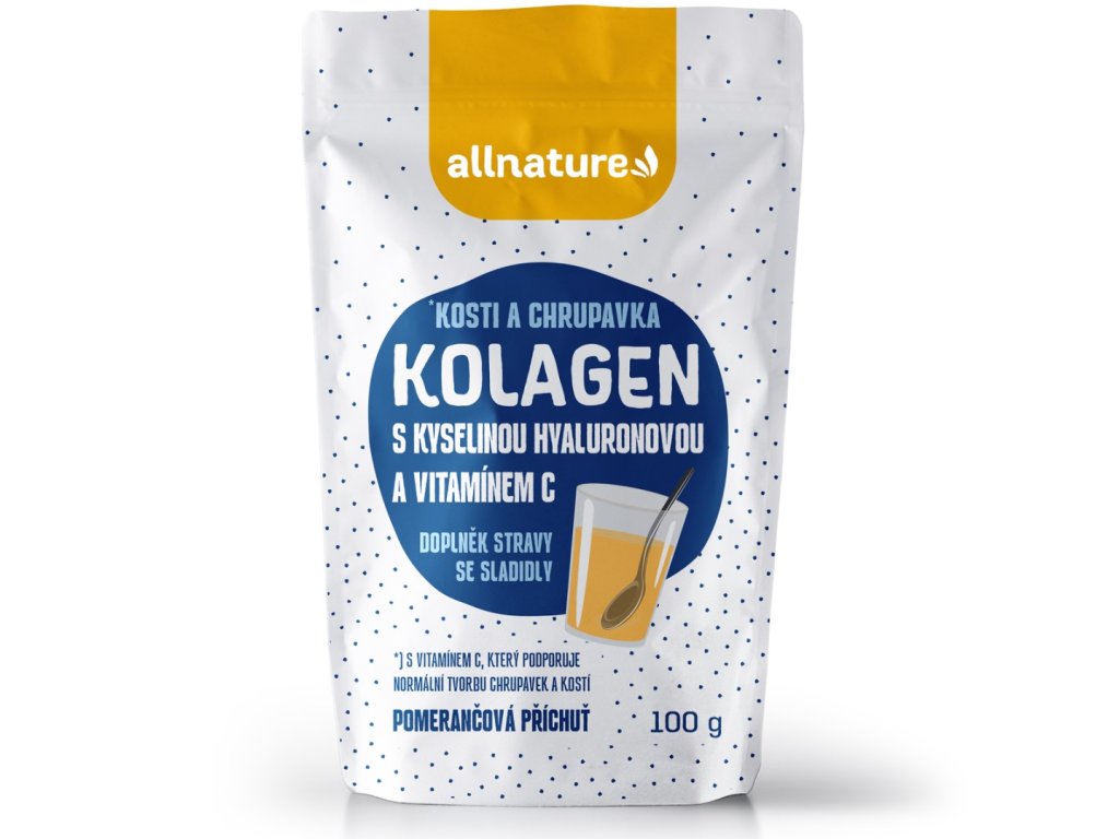 Doprajte svojej pokožke, chrupavkám a kostiam pravidelný prísun kolagénu v ideálnej kombinácii s kyselinou hyalurónovou a vitamínom C. Pravidelný prísun kolagénu v kombinácii s kyselinou hyalurónovou a vitamínom C je skvelým spôsobom, ako dosiahnuť hladkú, pružnú a hydratovanú pokožku. Táto zmes je tiež skvelá na podporu tvorby chrupaviek a kostí. Každý deň si pripravte lahodný kolagénový nápoj s príchuťou pomaranča. Allnature kolagén je sladený sukralózou, rýchlo sa rozpúšťa vo vode a skvele sa vstrebáva do organizmu.